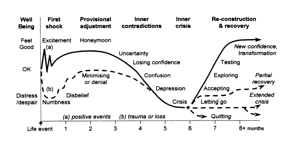 Every action in life, for me, has the shape of that curve, beyond just learning activities. We start a life event motivated, spectant and exited. This is the first shook, as if an activity or a life event that we worked hard for getting in, rather than being there just because of other casualties, then normally comes the provisional adjustment, which is also a wonderful time called honeymoon. We start to get exposed to know the other person, or know better the topic on which we are working, and see the potential match and goals together on this.