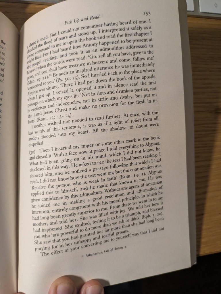 That marked Saint Augustine’s conversion. I believe. Confessions is another book, which is on my reading list, and usually on my desk. I have twelve pages more to go to my current read. I will read a short book after that, which is about 80ish pages. By the end of February, early March I should be done with those two. But there a few more directions to plan in detail.